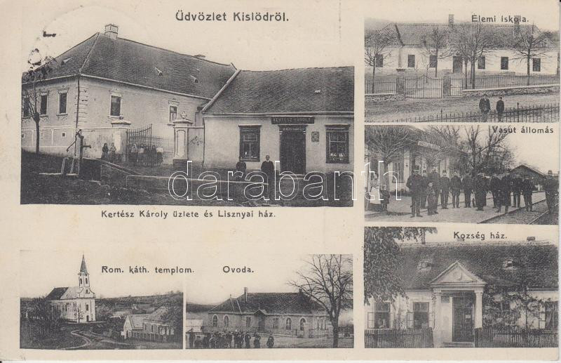 Beschreibung: Kislőd Kertész Károly üzlete és a Lisznyai ház, vasútállomás, községháza, elemi iskola, óvoda és katolikus templom