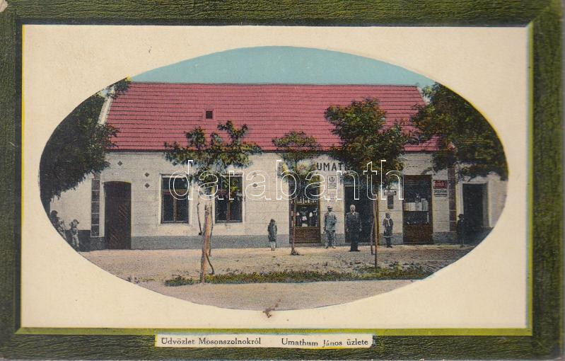 Mosonszolnok Umathum János üzlete (EK) https://www.darabanth.com/de/178-Fernauktion/178.0/Ansichtskarten/Ungarn~300004/Mosonszolnok-Umathum-Janos-uzlete-EK~II628477