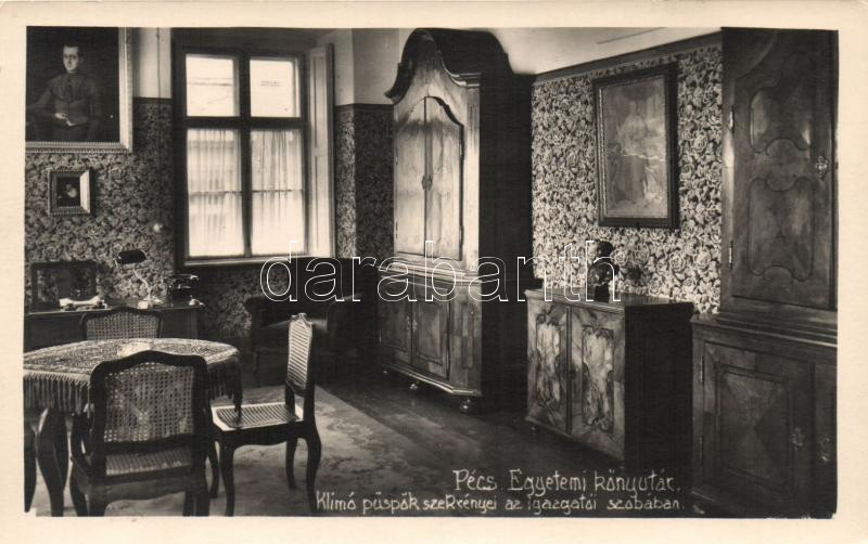 Pécs egyetemi könyvtár, Klimó püspök szekrényei az igazgatói szobában ... https://www.darabanth.com/de/178-Fernauktion/178.0/Ansichtskarten/Ungarn~300004/Pecs-egyetemi-konyvtar-Klimo-puspok-szekrenyei-az-igazgatoi-szobaban-kis-szakadas-smal~II624607