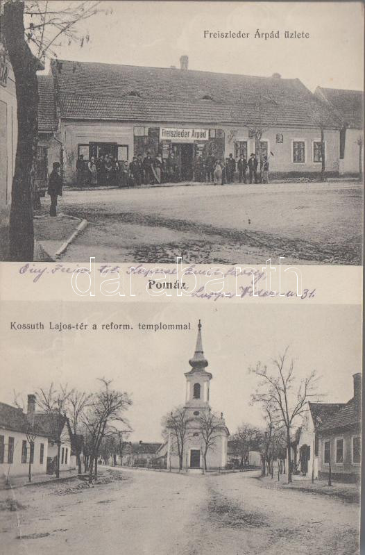 Pomáz Freiszleder Árpád üzlete, Kossuth Lajos tér a református templom... https://www.darabanth.com/de/178-Fernauktion/178.0/Ansichtskarten/Ungarn~300004/Pomaz-Freiszleder-Arpad-uzlete-Kossuth-Lajos-ter-a-reformatus-templommal-fa~II628420