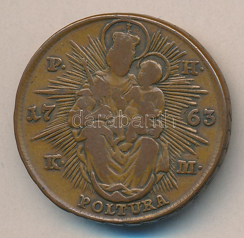 1763. PH-KM Poltura Cu "Mária Terézia" T:2- https://www.darabanth.com/de/178-Fernauktion/178.0/Numismatik/Ungarische-Munzen~600145/1763-PH-KM-Poltura-Cu-Maria-Terezia-T2-~II626228
