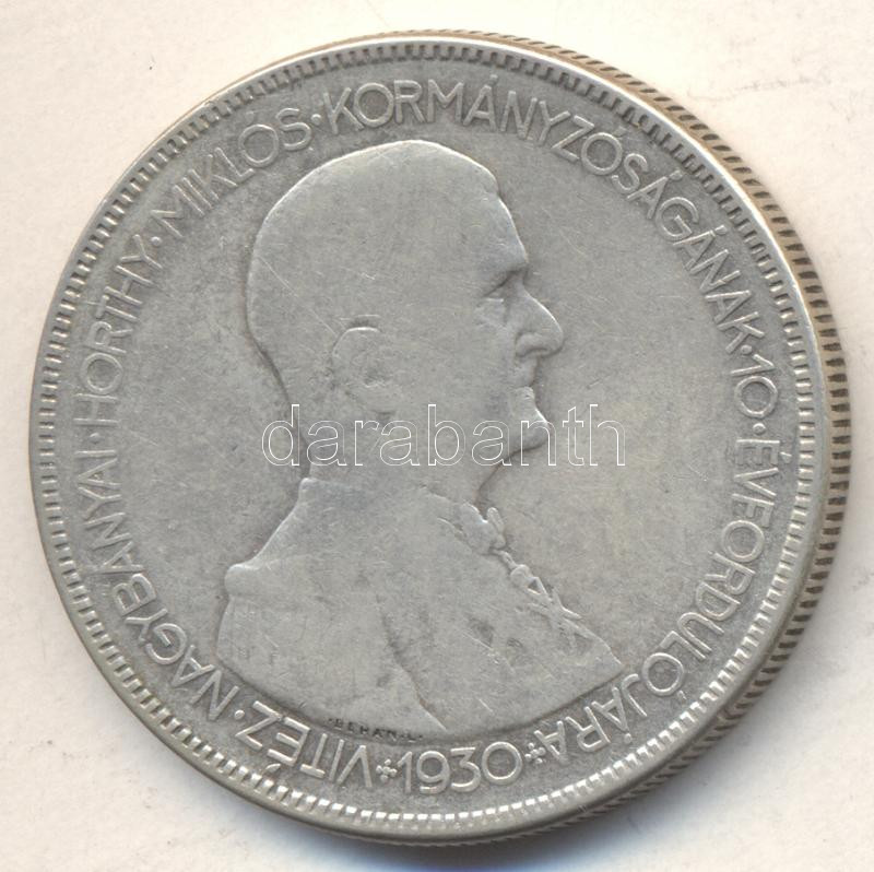 1930. 5P Ag "Horthy-jobbra" T:3 https://www.darabanth.com/de/178-Fernauktion/178.0/Numismatik/Ungarische-Munzen~600145/1930-5P-Ag-Horthy-jobbra-T3~II625166