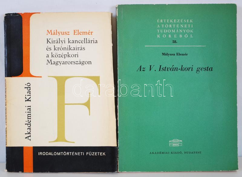 2 db könyv Mályusz Elemértől: Királyi kancellária és krónikaírás a középkori Magyarországon. Az V. István-kori gesta. Budapest 1971 és 1973. Akadémia Kiadó.