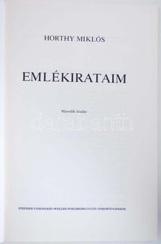 Horthy Miklós: Emlékirataim. Második kiadás. Toronto, 1974, Stephen Vö... https://www.darabanth.com/de/179-Fernauktion/179.0/Andere-Sammelgebiete/Bucher-Geschichte~400029/Horthy-Miklos-Emlekirataim-Masodik-kiadas-Toronto-1974-Stephen-Vorosvary-Kiadoi-egesz~II630258