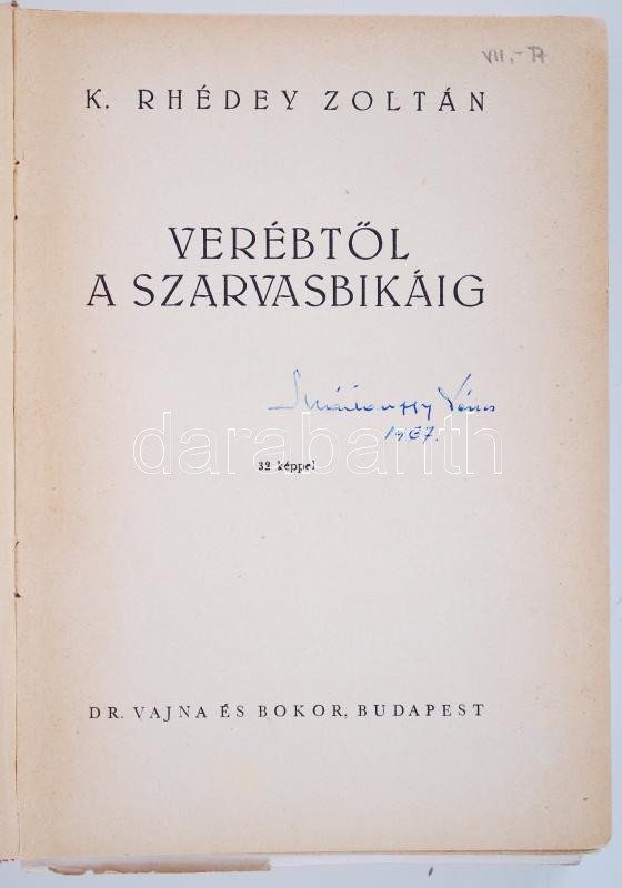 K. Rhédey Zoltán: Verébtől a szarvasbikáig. 32 képpel. Bp., 1943, Dr. ... https://www.darabanth.com/de/179-Fernauktion/179.0/Andere-Sammelgebiete/Bucher-Jagd~400033/K-Rhedey-Zoltan-Verebtol-a-szarvasbikaig-32-keppel-Bp-1943-Dr-Vajna-es-Bokor-Kiadoi~II636445