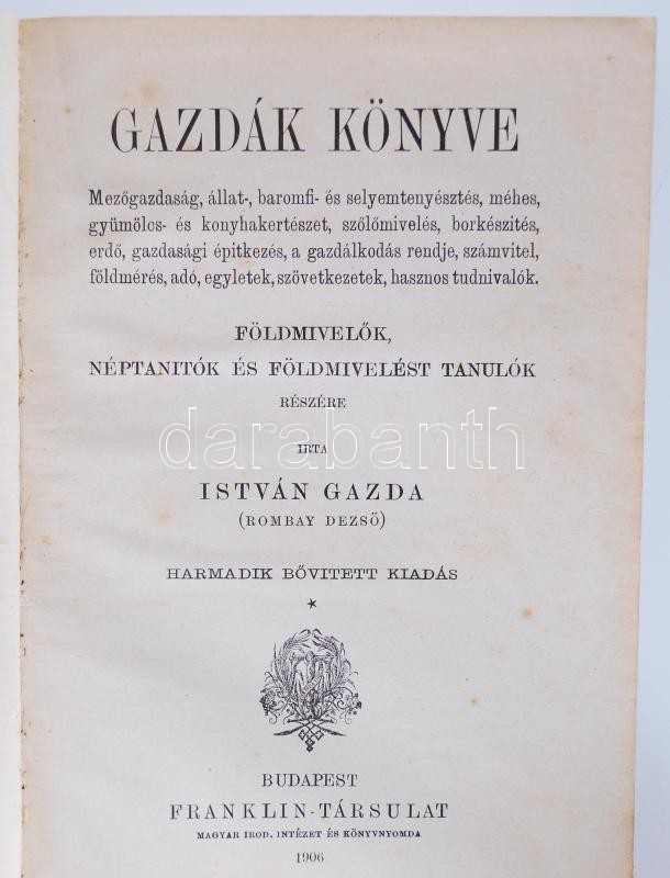 Rombay Dezső: Gazdák könyve. Budapest 1906. Franklin Társulat. Gerinc ... https://www.darabanth.com/de/179-Fernauktion/179.0/Andere-Sammelgebiete/Bucher-Kuche-und-Garten~400017/Rombay-Dezso-Gazdak-konyve-Budapest-1906-Franklin-Tarsulat-Gerinc-ragasztott~II630340