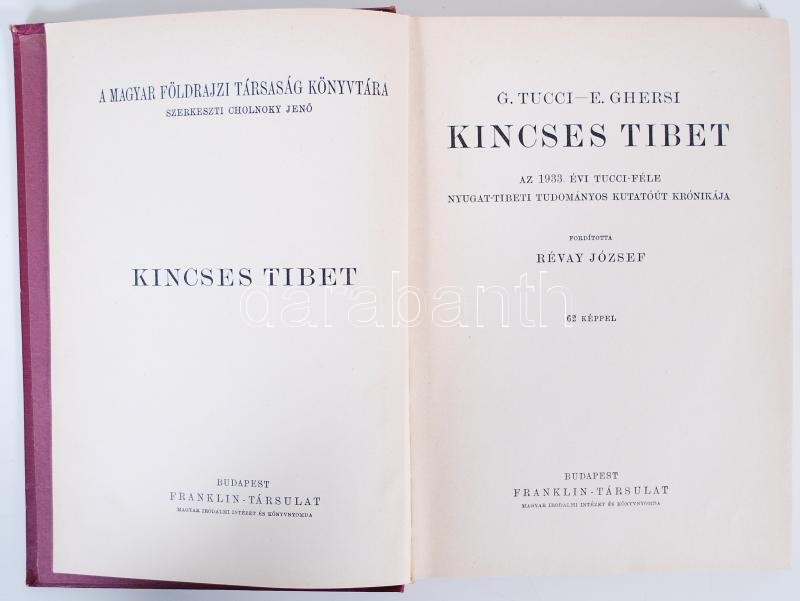 Magyar Földrajzi Társaság könyvtára: Tucii-Gersi: Kincses Tibet 62 képpel, kiadói, aranyozott egészvászon kötzésben jó állapotban, Franklin Társulat Budapest 1933