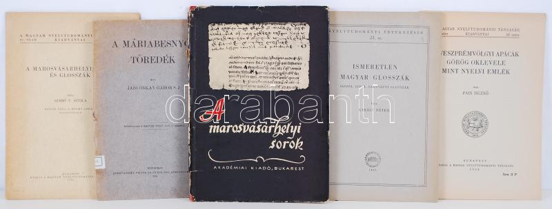 5 db nyelvemlékezettel kapcsolatos könyv: A marosvásárhelyi sorok. A marosvásárhelyi sorok és glosszák. A vészprémvölgyi apácák görög oklevele mint nyelvi emlék. Ismeretlen magyar glosszák. A máriabesnyői töredék