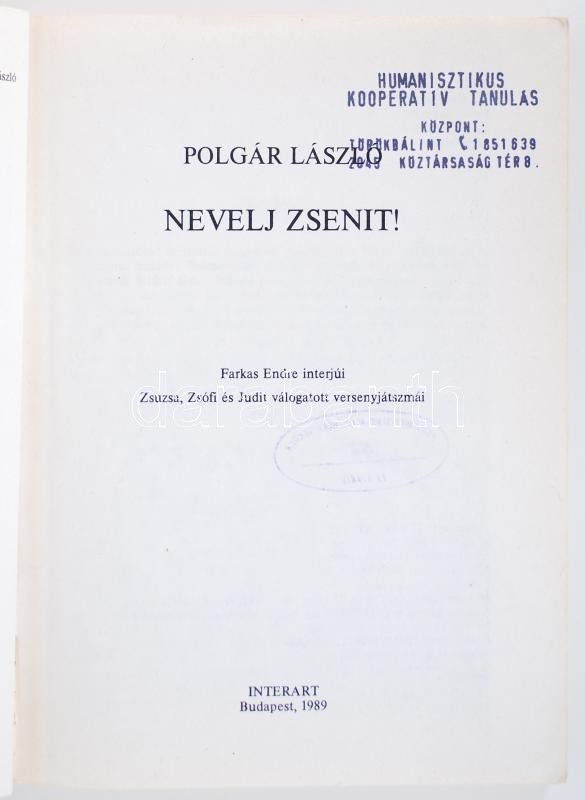 Polgár László: Nevelj zsenit! 101 sakkjátszma és feladvány. Bp., 1989,... https://www.darabanth.com/de/179-Fernauktion/179.0/Andere-Sammelgebiete/Bucher-Sonstige-Raritaten~400037/Polgar-Laszlo-Nevelj-zsenit-101-sakkjatszma-es-feladvany-Bp-1989-Interart-Kiadoi-papi~II636330