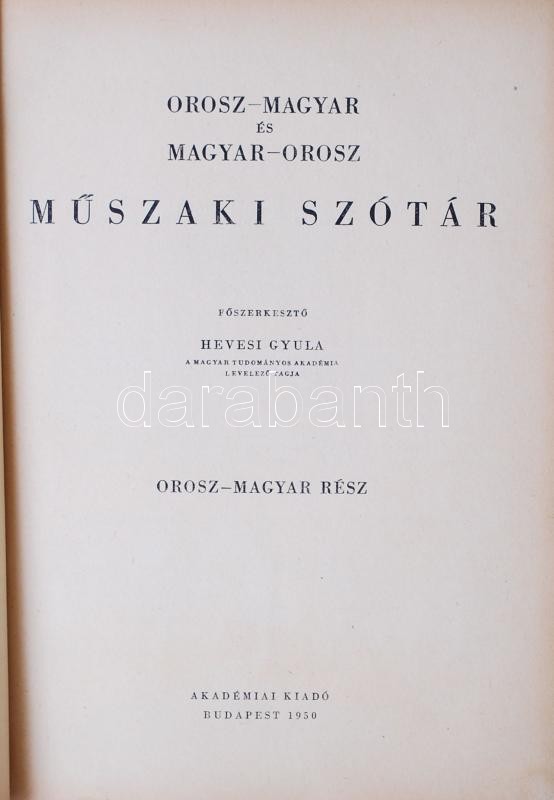 Orosz-magyar műszaki szótár. Főszerk. Hevesi Gyula. Bp., 1950, Akadémi... https://www.darabanth.com/de/179-Fernauktion/179.0/Andere-Sammelgebiete/Bucher-Wissenschaften~400030/Orosz-magyar-muszaki-szotar-Foszerk-Hevesi-Gyula-Bp-1950-Akademiai-Kiadoi-egeszvaszon~II636400