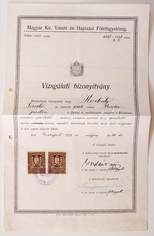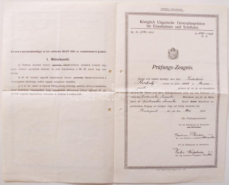 1931 Motorkezelői Vizsgálati bizonyítvány, magyarul németül https://www.darabanth.com/de/179-Fernauktion/179.0/Andere-Sammelgebiete/Dokument~400021/1931-Motorkezeloi-Vizsgalati-bizonyitvany-magyarul-nemetul~II633576