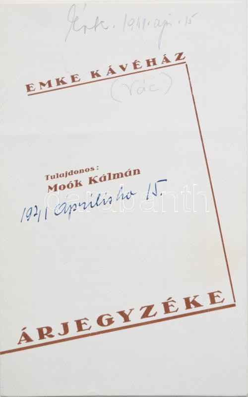 1941 Vác EMKE kávéház árjegyzéke 8p. https://www.darabanth.com/de/179-Fernauktion/179.0/Andere-Sammelgebiete/Drucksachen~400014/1941-Vac-EMKE-kavehaz-arjegyzeke-8p~II636793