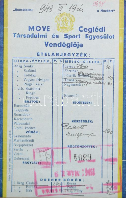1943 MOVE ceglédi vendéglőjének ételárjegyzéke https://www.darabanth.com/de/179-Fernauktion/179.0/Andere-Sammelgebiete/Drucksachen~400014/1943-MOVE-cegledi-vendeglojenek-etelarjegyzeke~II636806
