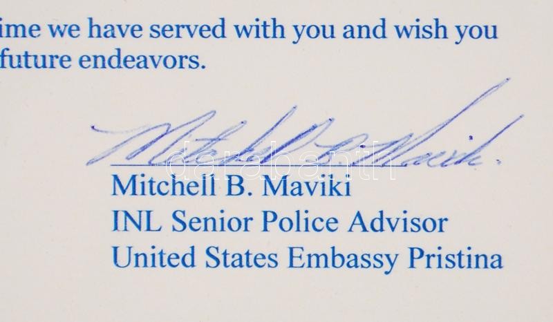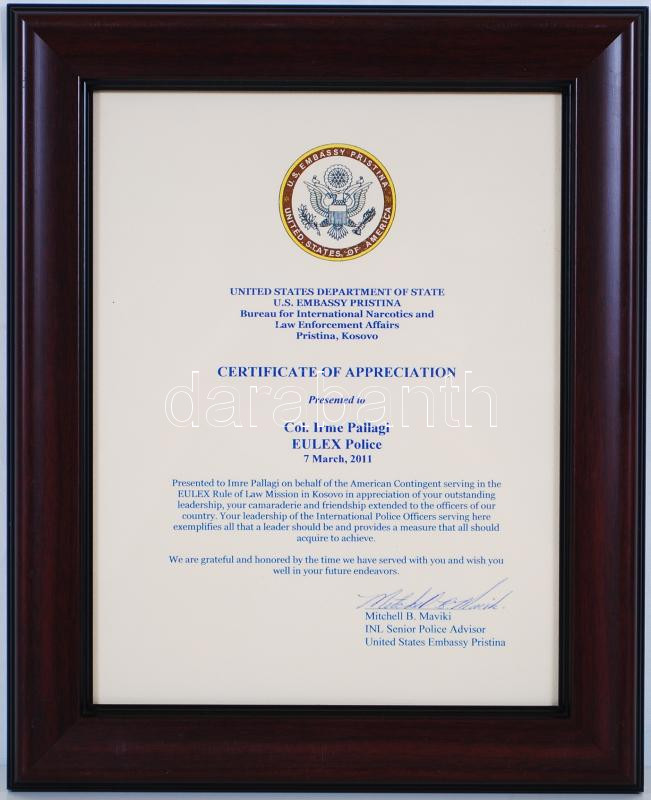 Beschreibung: 2011 Pristina, USA nagykövet által aláírt certifikáció Pallagi Imre számára, üvegezett keretben, 33×27 cm