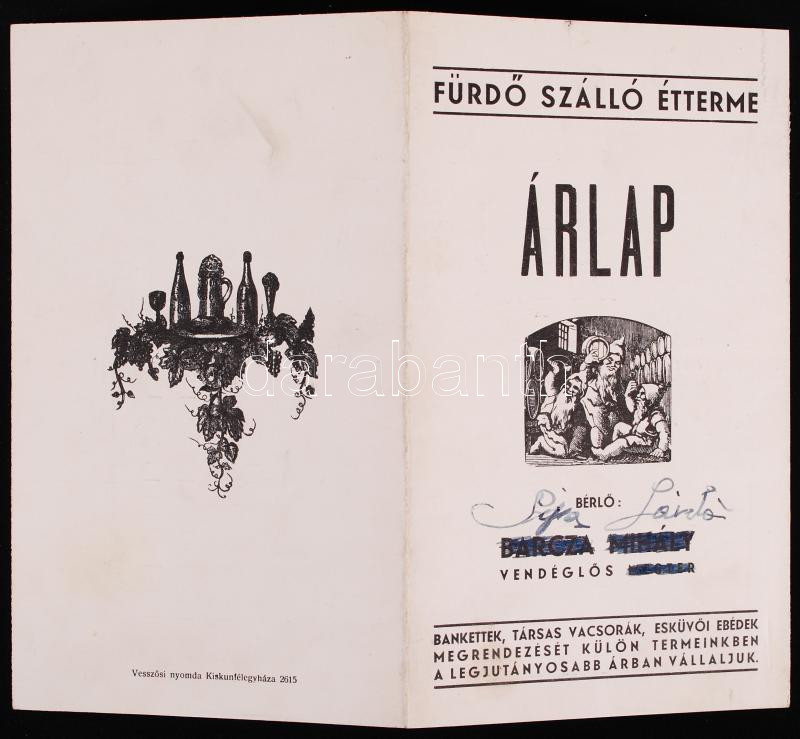 cca 1930 Kiskunfélegyháza Fürdő szálló étterme étlap https://www.darabanth.com/de/179-Fernauktion/179.0/Andere-Sammelgebiete/Drucksachen~400014/cca-1930-Kiskunfelegyhaza-Furdo-szallo-etterme-etlap~II636798