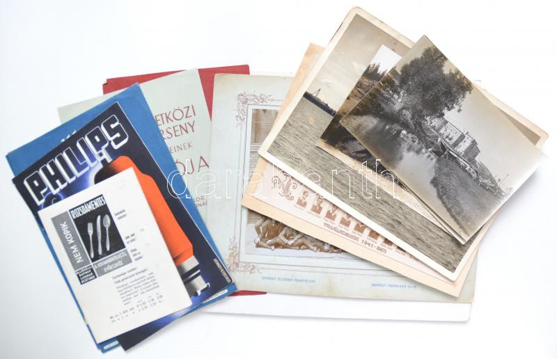 Beschreibung: cca 1940 vegyes nyomtatványtétel: kiállítás-meghívók, plakátok, szórólapok, prospektusok, 2db ceruza-, ill. tollrajz, 5db érdekes témájú fotó