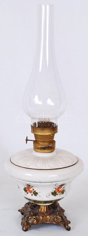 Beschreibung: Mázas kézzel festett, kerámia petróleumlámpa réz lábakkal, hibátlan üveg burával /