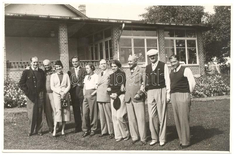 1937 Magyarországi nemzetközi teniszbajnokságon részt vevők egy csoportja: dr. Szlávy Béla, Minder Frigyes, b. Madarassy Beck Mala, Lauber Dezső, Lord Dundonald, Forgács Gábor, és mások, 11,5x17,5cm