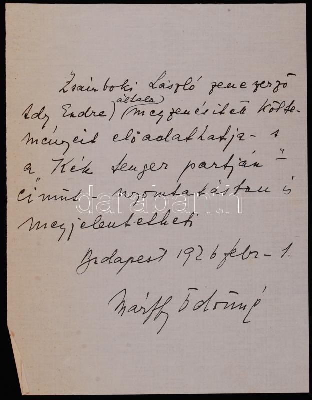 1926 Márffy Ödönné Csinszka autográf, aláírt nyilatkozata, melyben hozzájárul ahhoz, hogy Zsámboki László zeneszerző előadathassa Ady Endre általa megzenésített verseit, illetve egyet közülük publikálhasson is