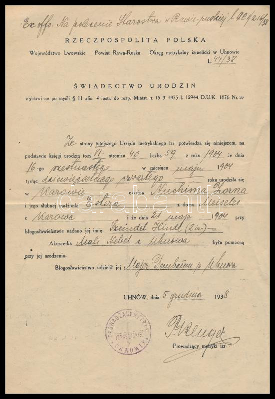 1938 A lengyelországi Uhnów városban kiadott születési bizonyítvány zs... https://www.darabanth.com/de/179-Fernauktion/179.0/Andere-Sammelgebiete/Judaica~400006/1938-A-lengyelorszagi-Uhnow-varosban-kiadott-szuletesi-bizonyitvany-zsido-szarmazasu-szem~II632506