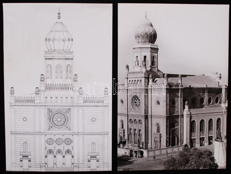 Beschreibung: 1964, egy darab nagyméretű fotó (29×20 cm) és egy darab fotogrammetriai rajz (29×18 cm) a kecskeméti zsinagógáról