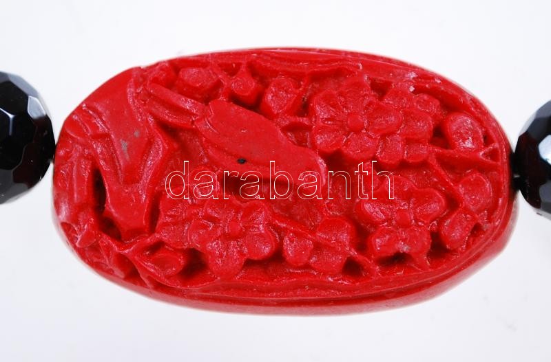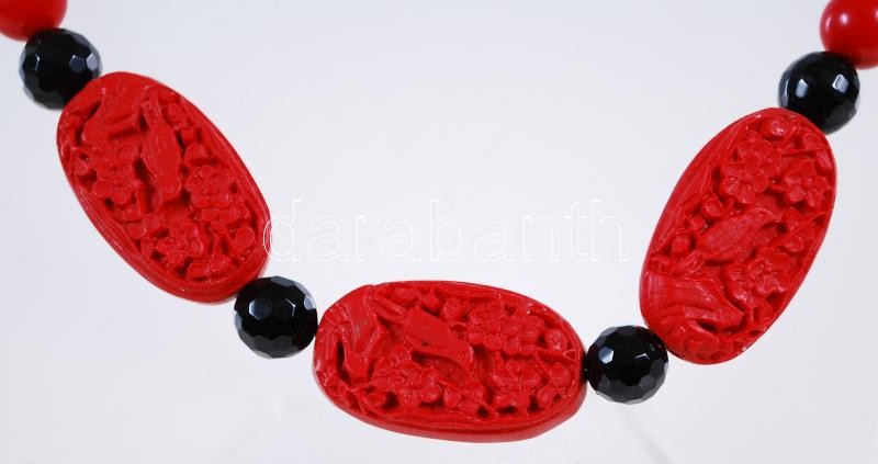 Korall, ónix és faragott lakk nyaklánc ezüst (Ag) szerelékkel /
