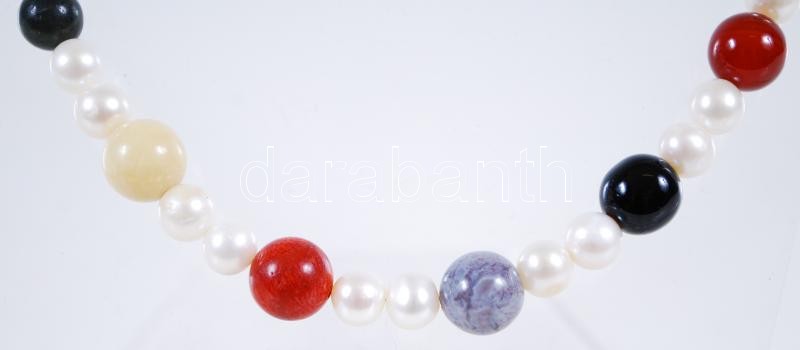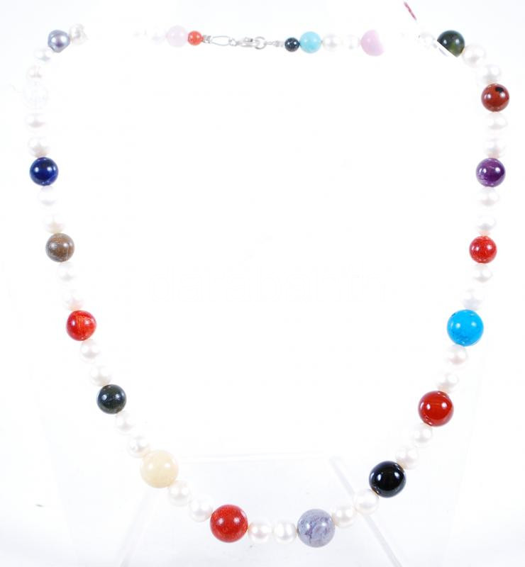 Beschreibung: Tenyésztett gyöngy nyaklánc vegyes kövekkel és ezüst (Ag) szerelékkel /