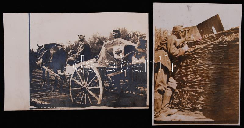 Beschreibung: 1916 2 db fotó: mesterlövész a lövészárokban, sebesült szállítása, 10×7 cm, 13×8 cm