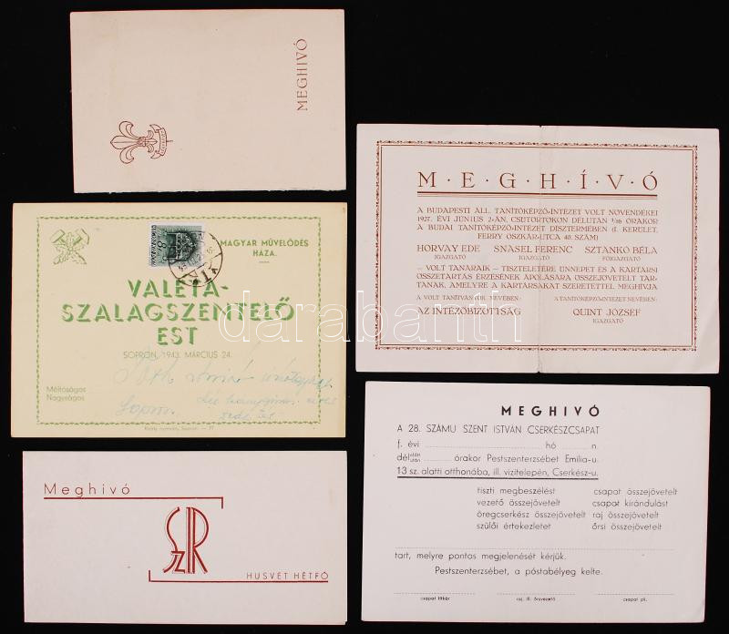 Beschreibung: cca 1930-1940 5db meghívó cserkész- és egyéb eseményekre