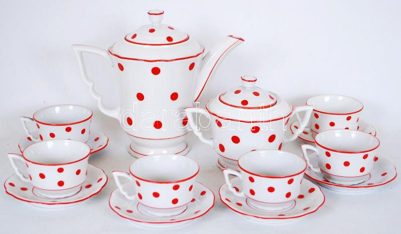 Beschreibung: 6 személyes komplett piros pöttyös Zsolnay porcelán kávéskészlet csésze, alj, kávés, tejes-kiöntő / Full 6 person Zsolnay chinaware coffe-set