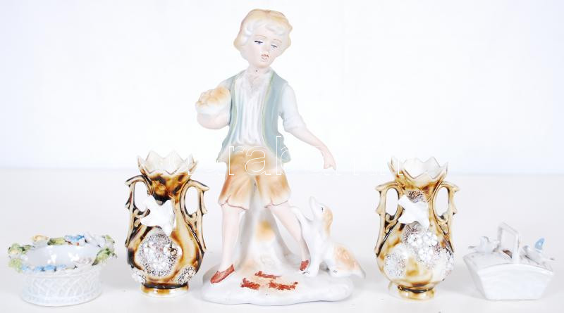 Beschreibung: Restaurátor tétel, összesen 5 db: mini váza pár, mini madaras kosár, kis virágos kosár, kis fiú és a kutyája, mindegyiken kisebb hibákkal