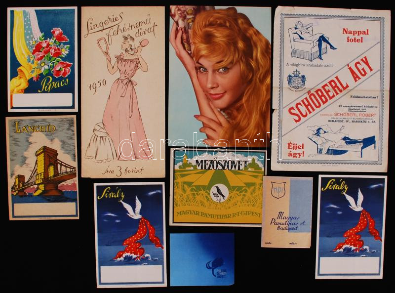 cca 1920-1945 18 reklám nyomtatvány: szövetek, ágy, porszívó, fehérnem... https://www.darabanth.com/de/179-Fernauktion/179.0/Andere-Sammelgebiete/Werbungen~600017/cca-1920-1945-18-reklam-nyomtatvany-szovetek-agy-porszivo-fehernemuk~II636011