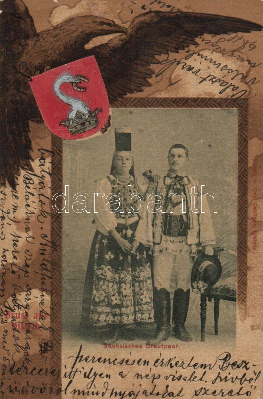Saxon bride and groom, Beszterce coat of arms, litho (b) https://www.darabanth.com/de/179-Fernauktion/179.0/Ansichtskarten/Folklore~600056/Saxon-bride-and-groom-Beszterce-coat-of-arms-litho-b~II632948