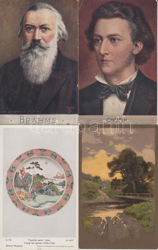 Beschreibung: 21 db régi motívumlap, zeneszerzők és festményreprodukciók