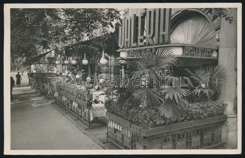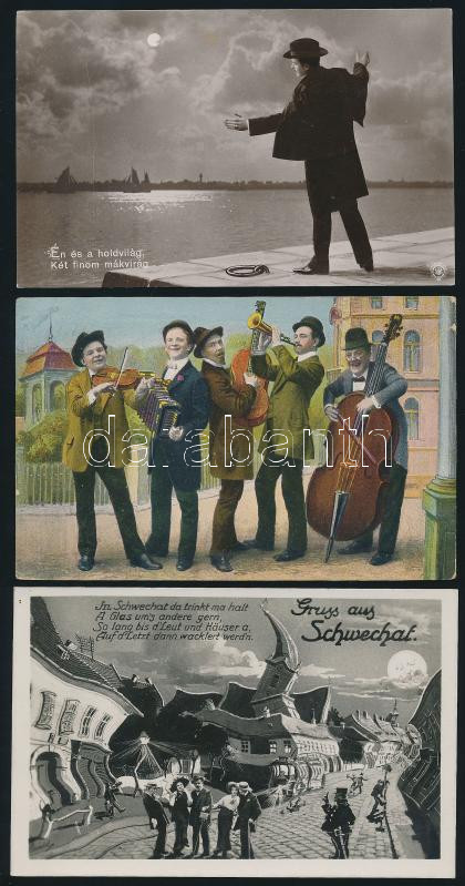 5 db régi képeslap: Schwechat éjszakai élet, Budapest Valéria Kávéház, Seress Rezső Én és a holdvilág... dalának illusztrációja, muzsikusok, és egy asztaltársaság csoportképe