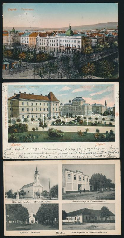 Beschreibung: 8 db régi képeslap a Történelmi Magyarország területéről: Vajdaság (Topolya, Nemesmilitics, Zombor), és 5 Zágráb lap
