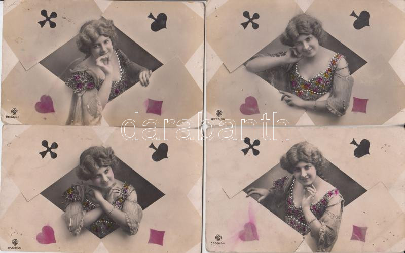 Beschreibung: Francia kártya és Hölgyek - 4 db háború előtti képeslap, vegyes minőség / Playing cards, ladies, 4 postcards