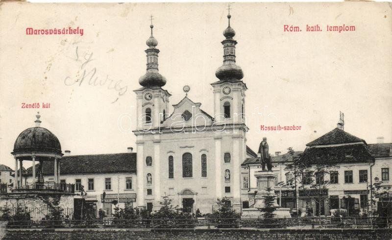 Marosvásárhely catholic church, music fountain, Kossuth statue, volunteer fire association, the glass and china warehouse of János Lukács, ironmongery and pharmacy (gluemark) (small tear)