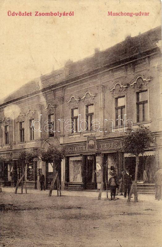 Zsombolya Muschong-udvar, Szinberger Lajos kereskedése https://www.darabanth.com/de/179-Fernauktion/179.0/Ansichtskarten/Siebenburgen~600007/Zsombolya-Muschong-udvar-Szinberger-Lajos-kereskedese~II630659