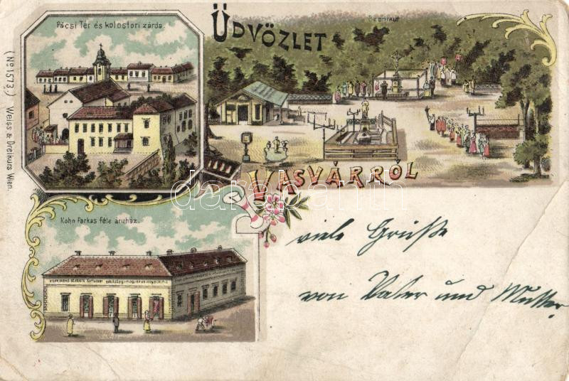 1899 Vasvár Kohn Farkas áruháza, kolostori zárda, Szent kút, litho (fa... https://www.darabanth.com/de/179-Fernauktion/179.0/Ansichtskarten/Ungarn~600006/1899-Vasvar-Kohn-Farkas-aruhaza-kolostori-zarda-Szent-kut-litho-fa~II633568