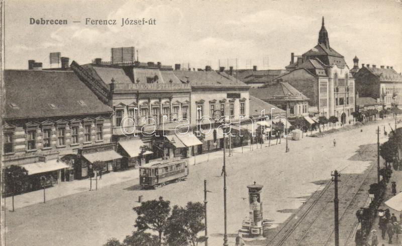 Beschreibung: Debrecen Ferenc József út (Piac utca), Márkus Jenő Pannónia Szállodája, Riesz Lipót cukrászüzlete, villamos