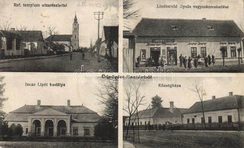 Beschreibung: Esztár Lindenfeld Gyula vegyeskereskedése, Incze Lipót kastélya, községháza (EK)