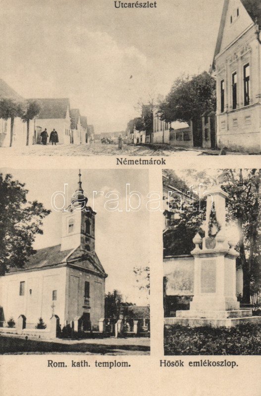 Németmárok Római katolikus templom, Hősök emlékszobra (wet damege) https://www.darabanth.com/de/179-Fernauktion/179.0/Ansichtskarten/Ungarn~600006/Nemetmarok-Romai-katolikus-templom-Hosok-emlekszobra-wet-damege~II582073