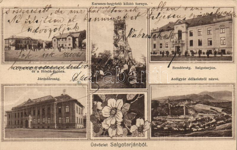 Beschreibung: Salgótarján Piac tér a vasútállomással és postával, rendőrség, járásbíróság, acélgyár, a Karancs hegytető kilátó tornya