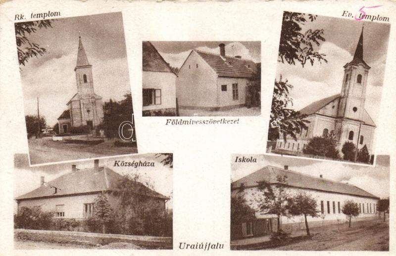 Beschreibung: Uraiújfalu földművesszövetkezet, községháza, iskola, templomok (kis szakadás / small tear)