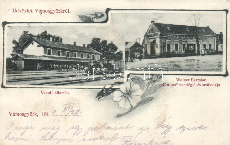 Vámosgyörk vasútállomás, Weiner Bertalan Korona vendéglő és szállodája https://www.darabanth.com/de/179-Fernauktion/179.0/Ansichtskarten/Ungarn~600006/Vamosgyork-vasutallomas-Weiner-Bertalan-Korona-vendeglo-es-szallodaja~II634047