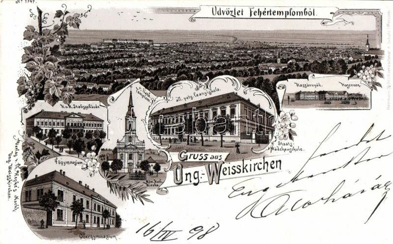 1898 Fehértemplom barracks, girl school, main grammar school, church, ... https://www.darabanth.com/de/179-Fernauktion/179.0/Ansichtskarten/Vojvodina~600011/1898-Fehertemplom-barracks-girl-school-main-grammar-school-church-litho-EK~II633412
