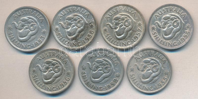 Australia 19... https://www.darabanth.com/de/179-Fernauktion/179.0/Numismatik/Auslandische-Munzen~300013/Ausztralia-1952-1958-1Sh-Ag-7x-klf-evszammal-TVegyes-3Cbr3EAustralia-1952-1958-Shilling-Ag-~II631200
