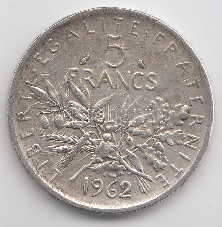 France 1962. 5 Francs Ag C:VF https://www.darabanth.com/de/179-Fernauktion/179.0/Numismatik/Auslandische-Munzen~300013/Franciaorszag-1962-5Fr-Ag-T2--3Cbr3EFrance-1962-5-Francs-Ag-CVF~II631066