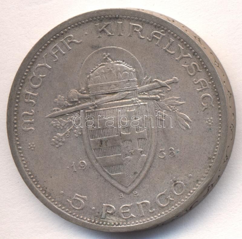 1938. 5P Ag "Szent István" T:2- https://www.darabanth.com/de/179-Fernauktion/179.0/Numismatik/Ungarische-Munzen~300009/1938-5P-Ag-Szent-Istvan-T2-~II635683
